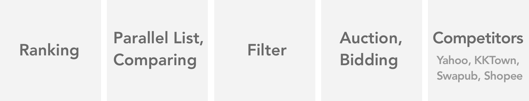 Before I jumped into the research and design process, I first quickly fetched some related information in my head and outlined a few directions for research. To compare a list of offers, ranking, parallel listing and comparing, and filtering results are common methods. Alternatively, auction/public bidding is also an attractive way for buying and selling, as some of the shopping apps competitors have applied.