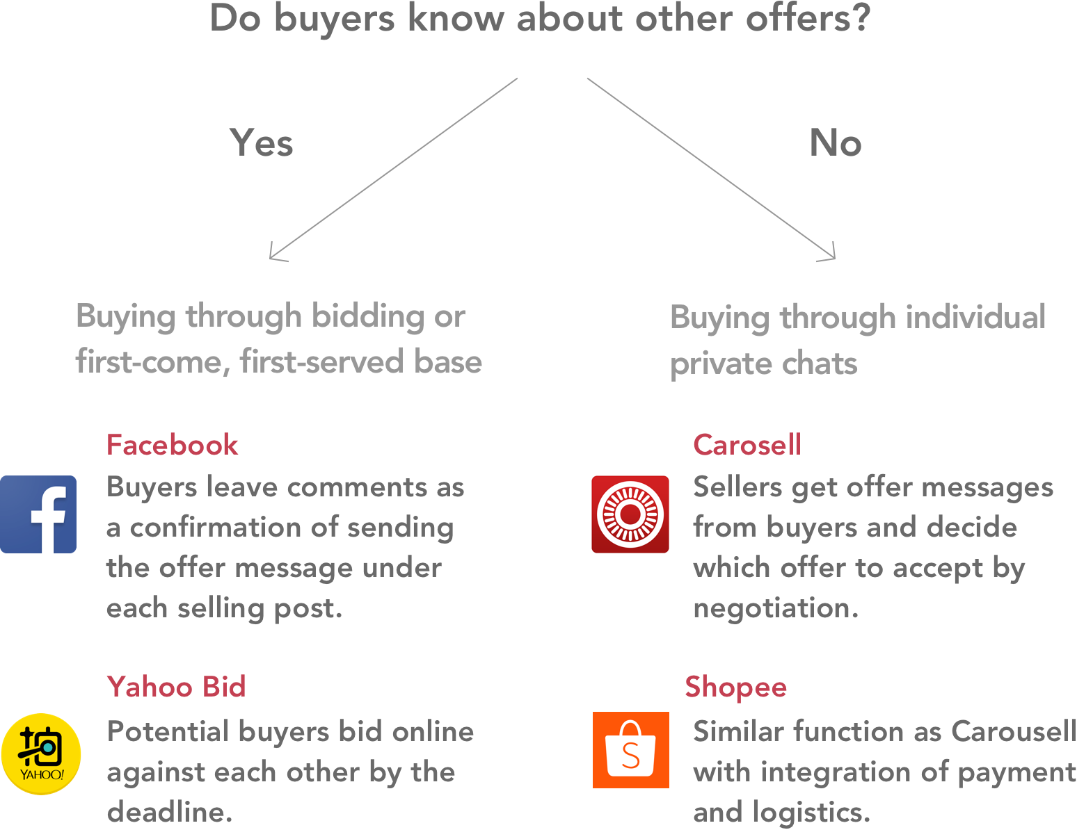 Since Carousell is my target design product, I spent quite a while researching its design and trading process. Besides, as Facebook group serves as the main used-goods trading platform for students in the US, Yahoo Bid as a main player in c2c e-commerce market in Taiwan, I researched their features and analyzed the logic behind the design.