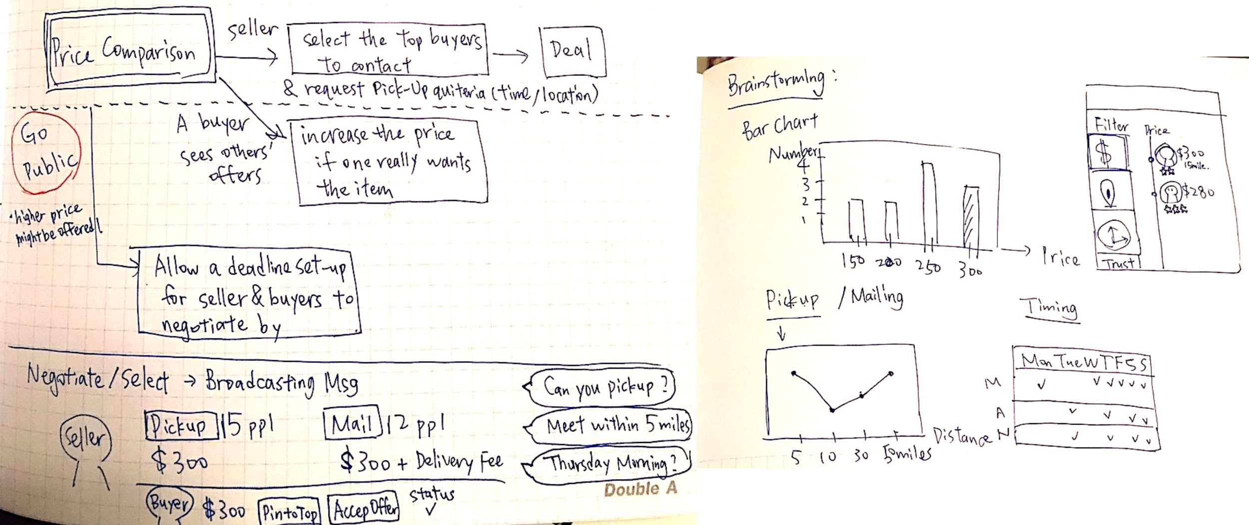 During the brainstorming, I first came up with features to visualize main factors like price, location, and timing, including bar chart, calendar and filter. Then I thought about the negotiation process, where sellers can either contact a few top buyers after comparing offers or choose to “go public” to enter a bidding system to let buyers compete for the product.