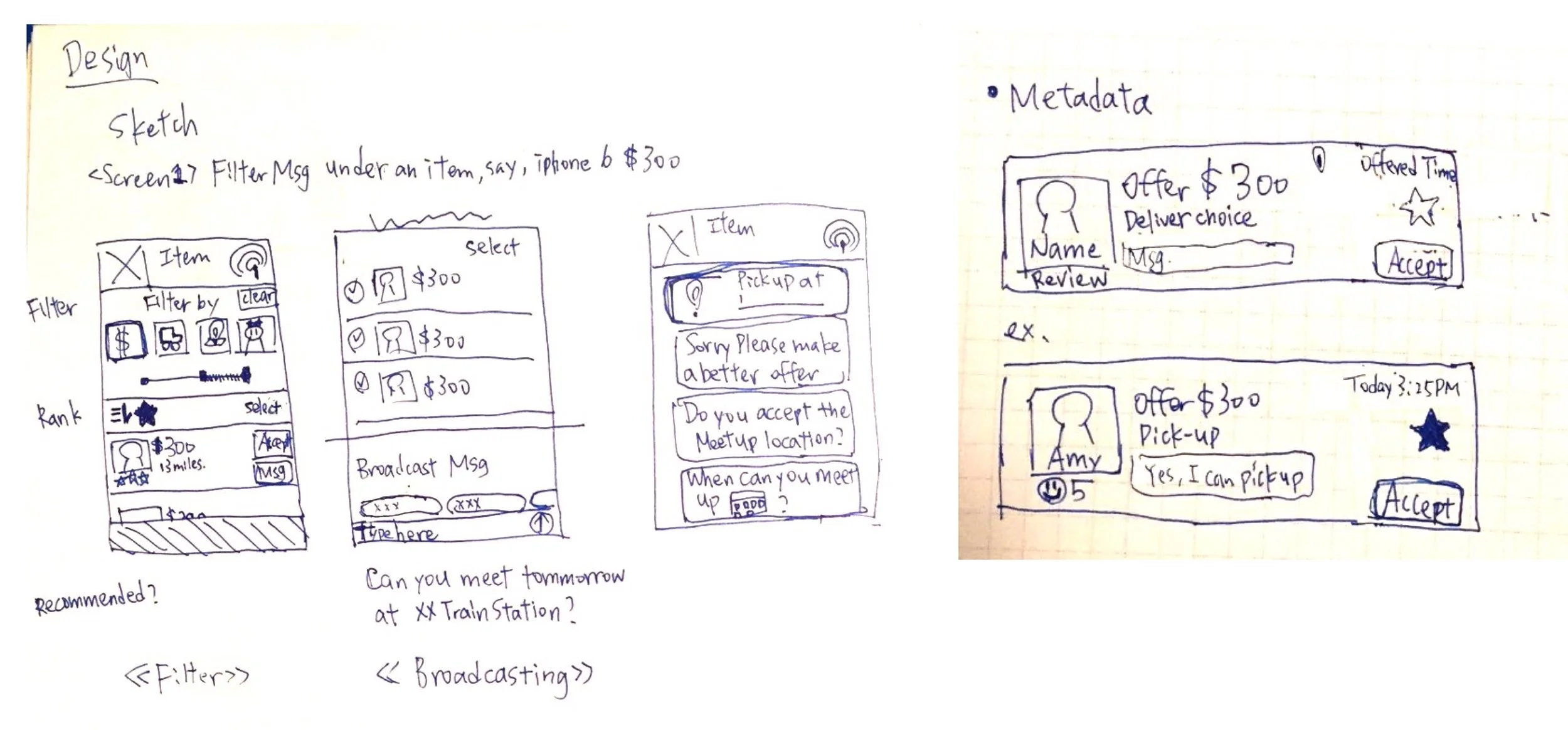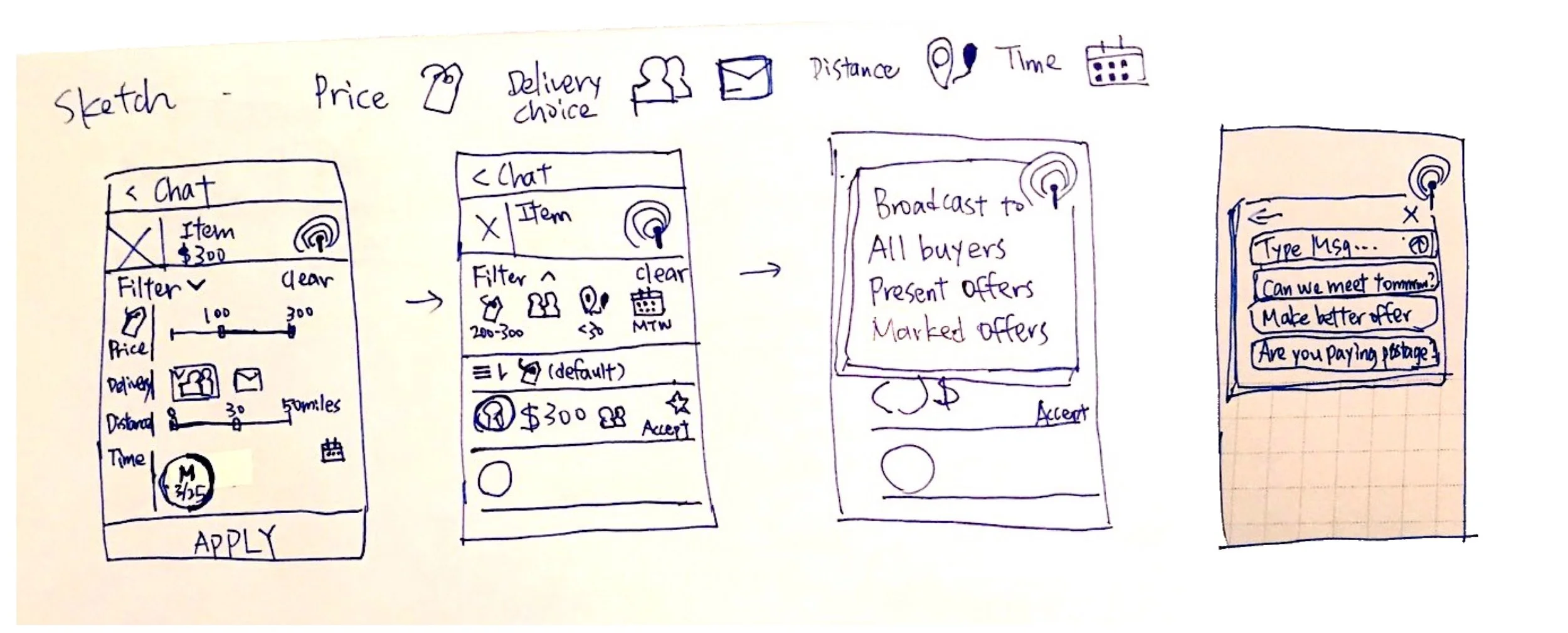 However, as some goods are more popular than the others, such as highly valued items like iPhone, watch or accessory, sometimes a seller might get a overwhelming number of offers and can’t manage to sift through multiple chats and offers. It is hard for the seller to consider price, timing and location all at once while negotiating with potential buyers. Thus, in this design challenge, I was asked to design on top of the existing app to solve this challenge –
