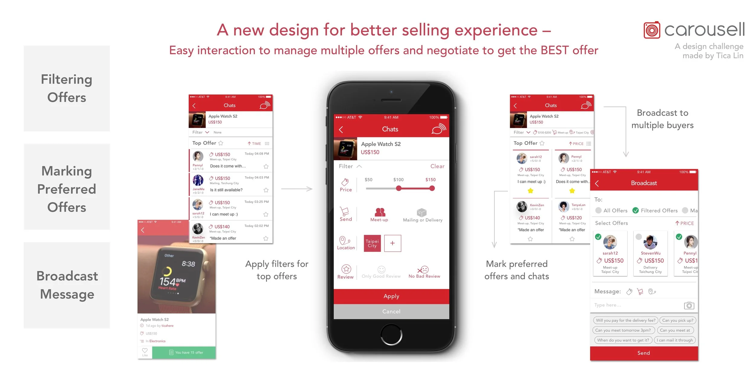 The most chaos happens in the middle of the user journey– filtering offers, deciding which offers to chat to, and negotiating among multiple potential buyers. And this is what my following design tries to solve.