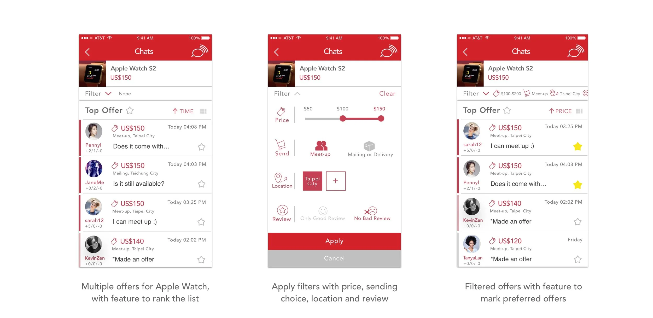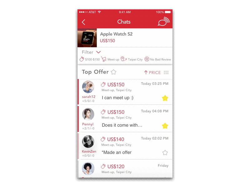 The seller in this use case, let’s say Tom, is selling an Apple Watch at $150 and got multiple offers. He applied the filer to filter offers with price range in $100-$150, getting the product by meet-up in Taipei city, and buyers with no bad reviews.