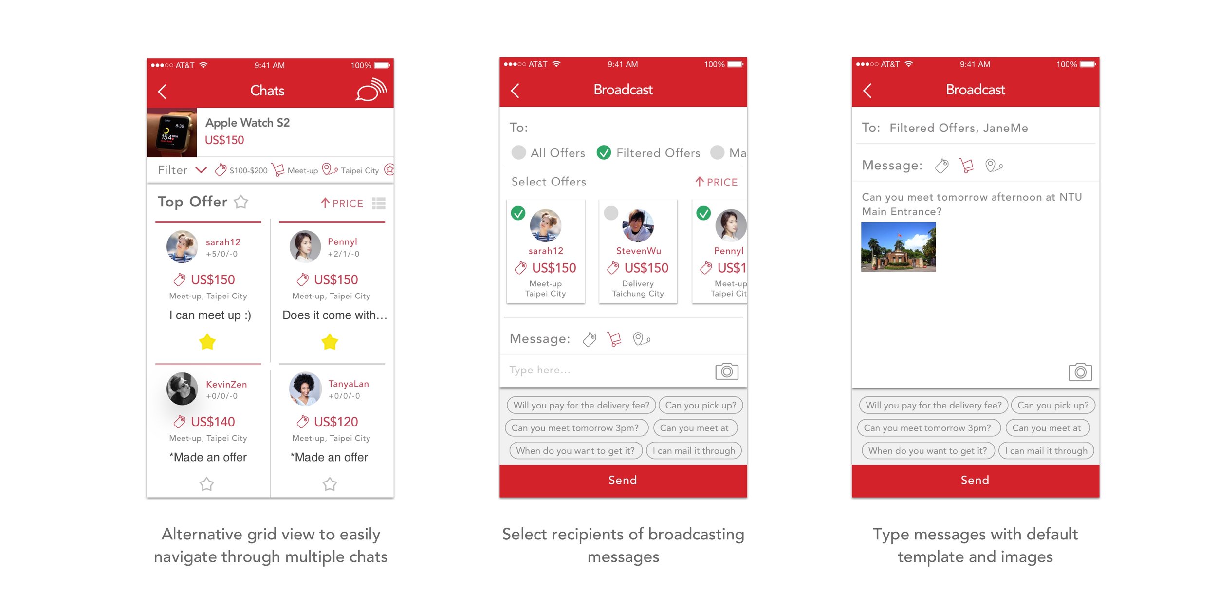 After filtering offers based on requirements, Tom wants to negotiate with them all at once. By clicking “Broadcast”, he is able to send a message to all filtered offers, marked or selected buyers, to confirm meetup timing and location, with some default sentences to choose from. By this broadcasting system, he will be able to accept whichever confirms the first!