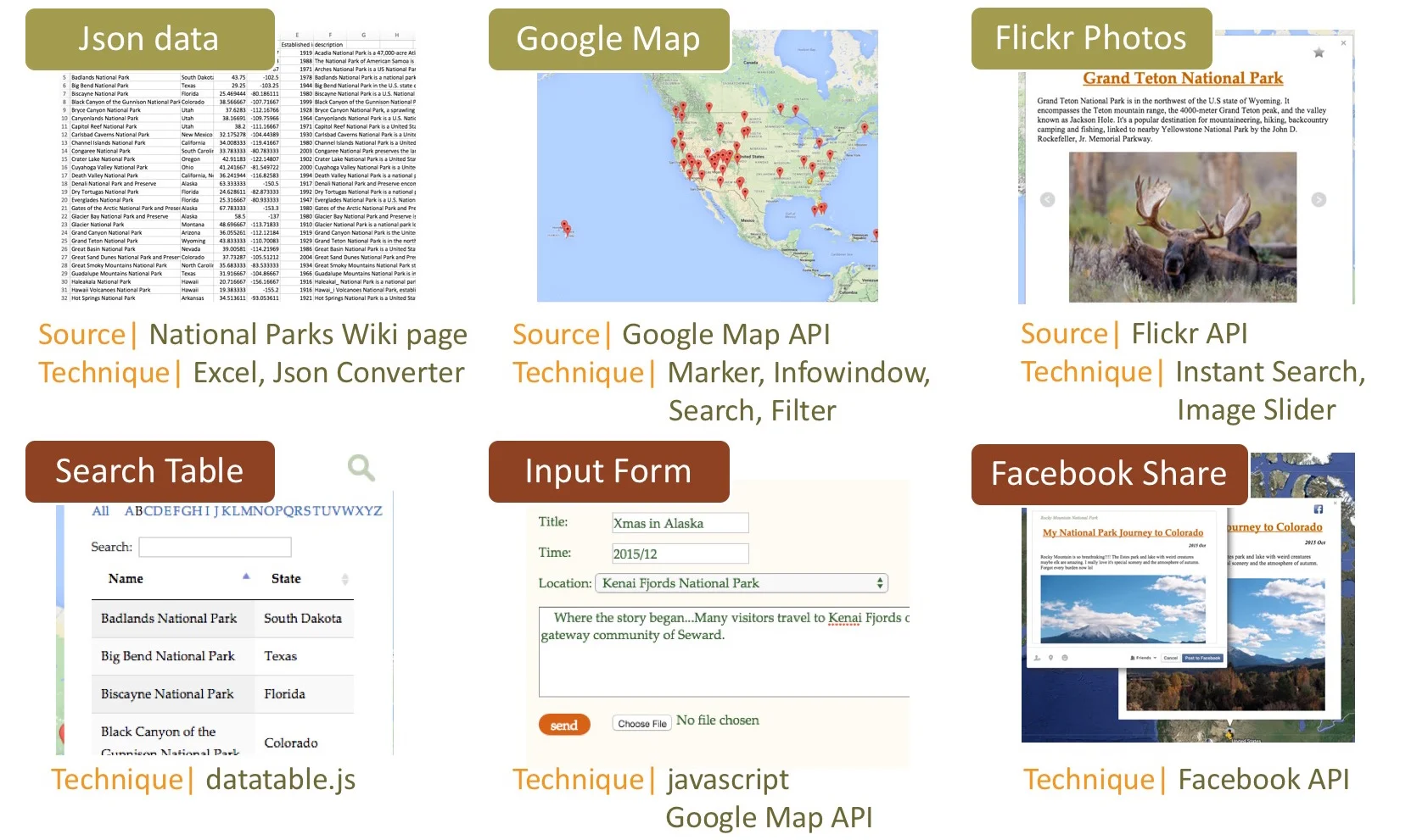 National Park Service, Wikipedia and Flickr provide different parts of national parks' information, including feature description, geographic information and photographs, which I want to integrate and redesign.