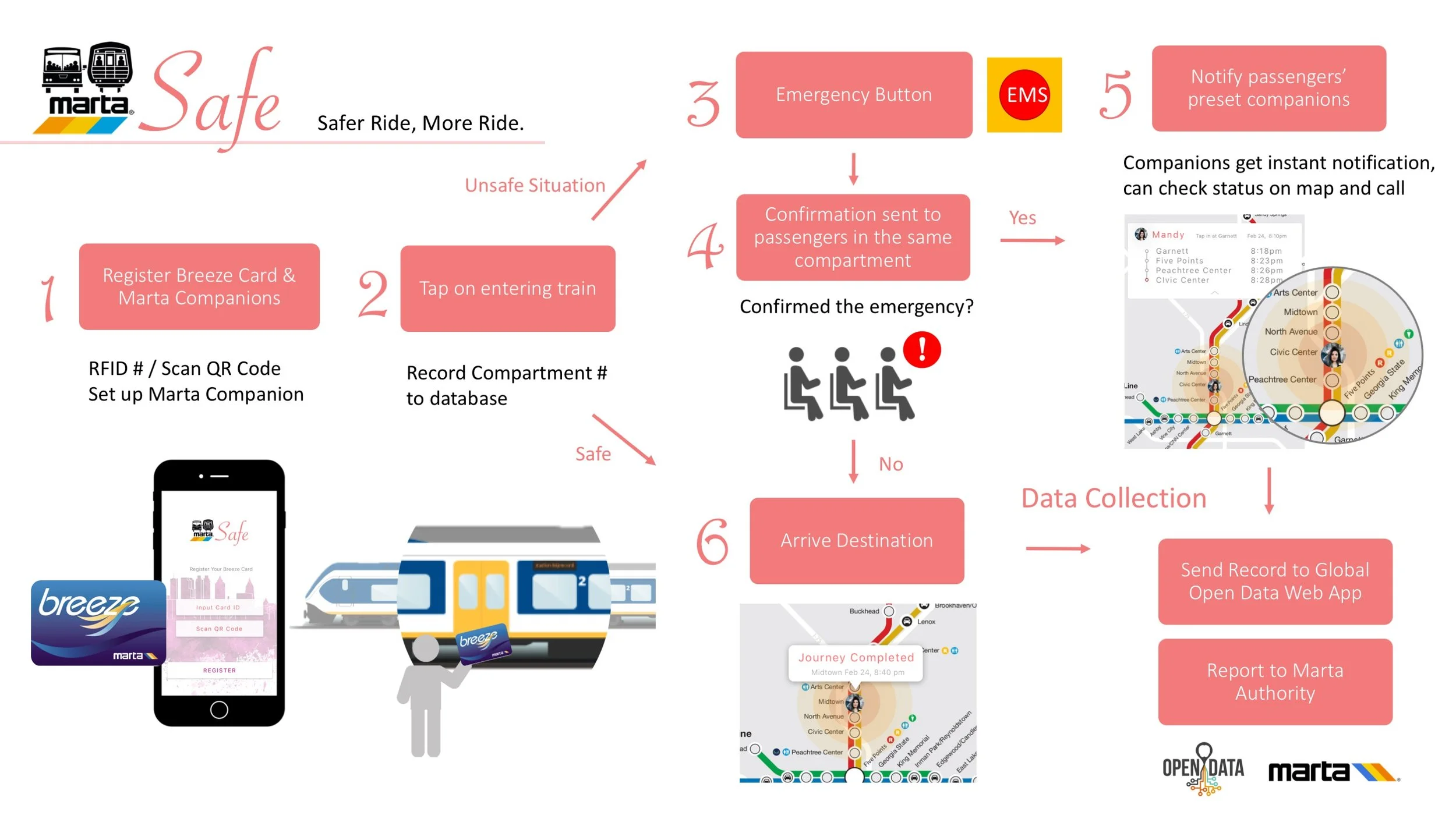 Through the conversation with Marta riders, the most concern about riding Marta alone, especially for women and students, was the feeling of being unsafe in the unpredictable environment. Even the actual criminal events happening on Marta isn't that noticeable, the unsafe feeling will amplify the perception of danger and reduce the riding willing. By designing this Safe Marta system, we hope to increase rider confidence with easy access to instant help and notice from crowdsourcing report. One judge for Marta Hackathon actually confirmed her increase in confidence being able to track her kid's riding status and knowing she'll be notified immediately at the emergency.